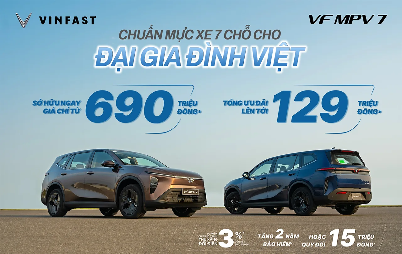 Việc sở hữu VF MPV 7 trở nên dễ tiếp cận hơn, không chỉ ở mức chi phí mà còn ở trải nghiệm – từ không gian rộng rãi, vận hành êm ái đến sự linh hoạt phù hợp cho cả nhu cầu hằng ngày lẫn những chuyến đi dài. Đặc biệt, với chương trình Thu xăng – Đổi điện ưu đãi 3% trên giá bán (*), hành trình chuyển đổi sang xe điện cũng trở nên nhẹ nhàng hơn: