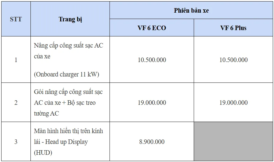 VinFast VF 6: Mức giá bán lẻ tham chiếu không kèm sạc hoặc kèm sạc, cùng trang bị tuỳ chọn lần lượt là:
